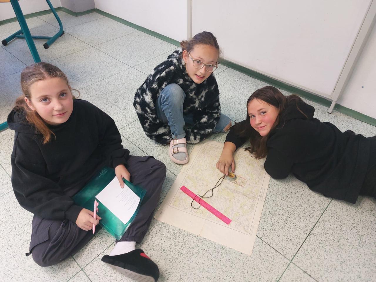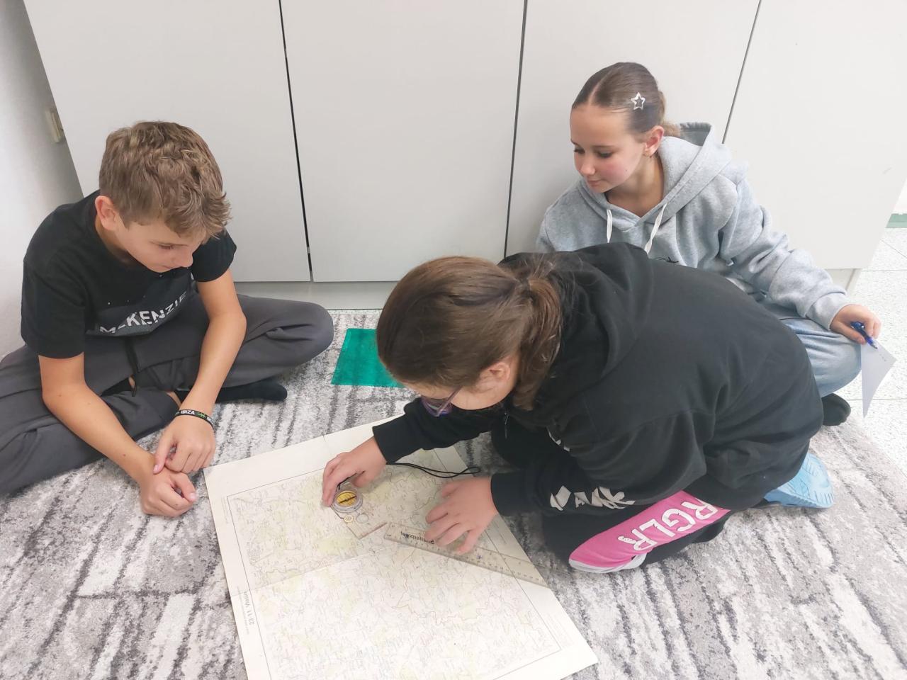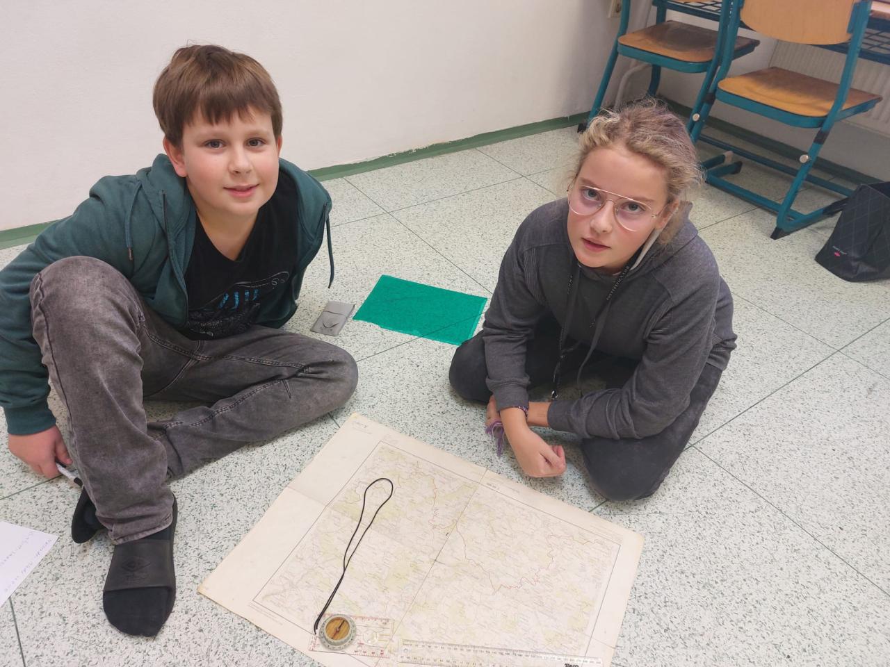 Orientace na mapě s paní učitelkou Lorencovou. Pracujeme ve skupinách.