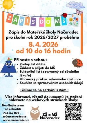 Zápis do MŠ Načeradec proběhne dne 8.4.2026 od 10 do 16 hodin.